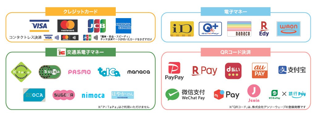 PayPay、楽天Pay、d払い、au Pay、Ali Pay(支付宝)、We Chat Pay(微信支付)、メルペイ、Jcoin、ゆうちょPay
